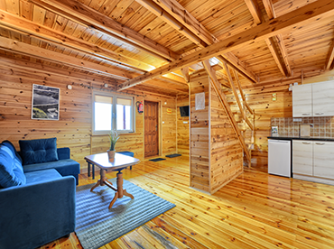 Domki 8-10 osobowe posiadają 1 salon, 2 oddzielne sypialnie i 1 łazienkę z prysznicem. W kuchni dostępna jest płyta kuchenna, lodówka, przybory kuchenne i czajnik elektryczny.
